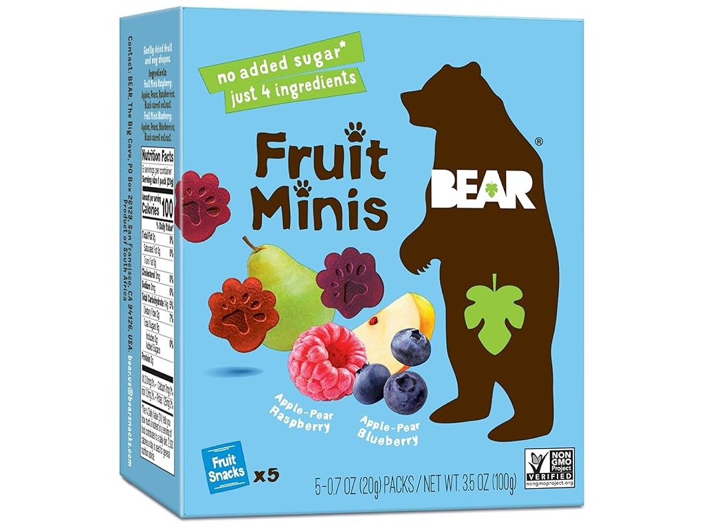 Vedeli ste, že čučoriedky a maliny sú super ovocie? Lahodné ovocie plné vitamínov a antioxidantov. Preto sme si v spoločnosti BEAR povedali: zdá sa, že je to ideálna kombinácia pre lahodnú príchuť Ovocných Minis. Malé ovocné snacky v tvare labky z jabĺk, hrušiek a nášho super ovocia: malín a čučoriedok. Dobré bobule, ako hovoríme! Malé ovocné občerstvenie v tvare labiek, ktoré si deti zamilujú a rodičia zbožňujú. Ideálne na chrumkanie doma, v škole, v aute alebo kdekoľvek chcete. Bez neporiadku, vyrobená zo skutočného ovocia a bez pridania cukru. To môže byť len super!
