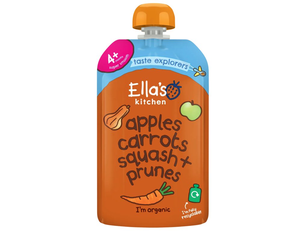 detská výživa 4+ mesiace. Len rozmixované ovocie a zelenina s prirodzene sa vyskytujúcim cukrom.Dobrý deň! Som 100% prírodné ovocné pyré z Ella's Kitchen plné chutného 100% organického pyré z maslovej tekvice, mrkvy, jabĺk + sušených sliviek s trochou citrónovej šťavy. Nič iné sa nepridáva, dokonca ani voda.