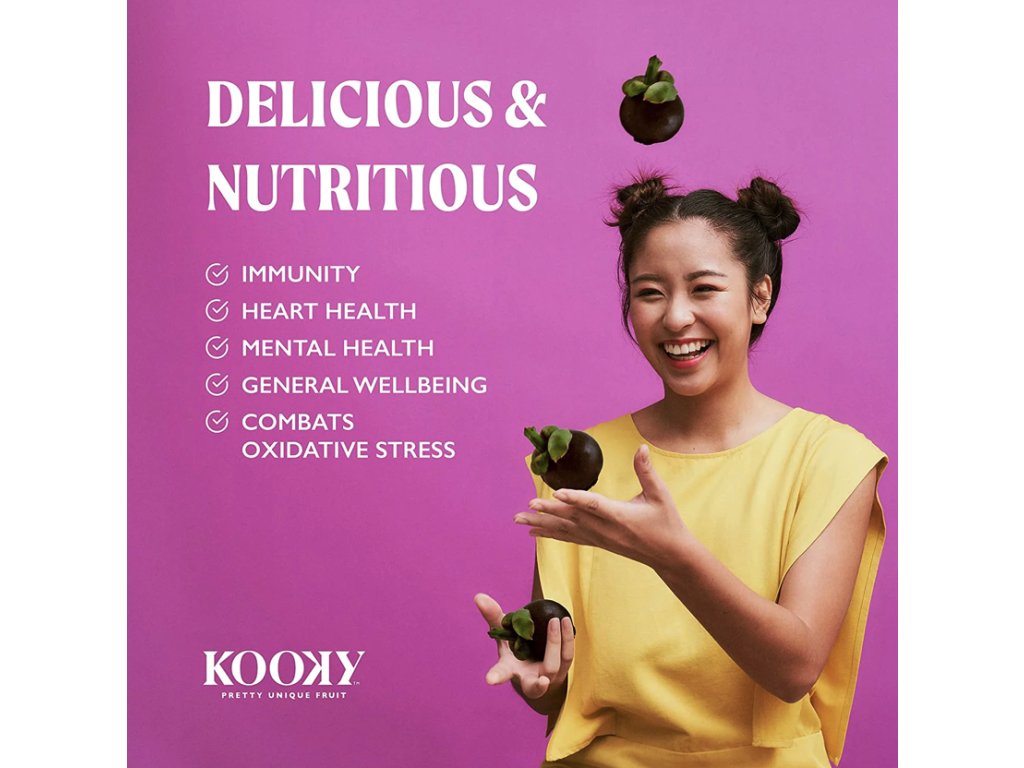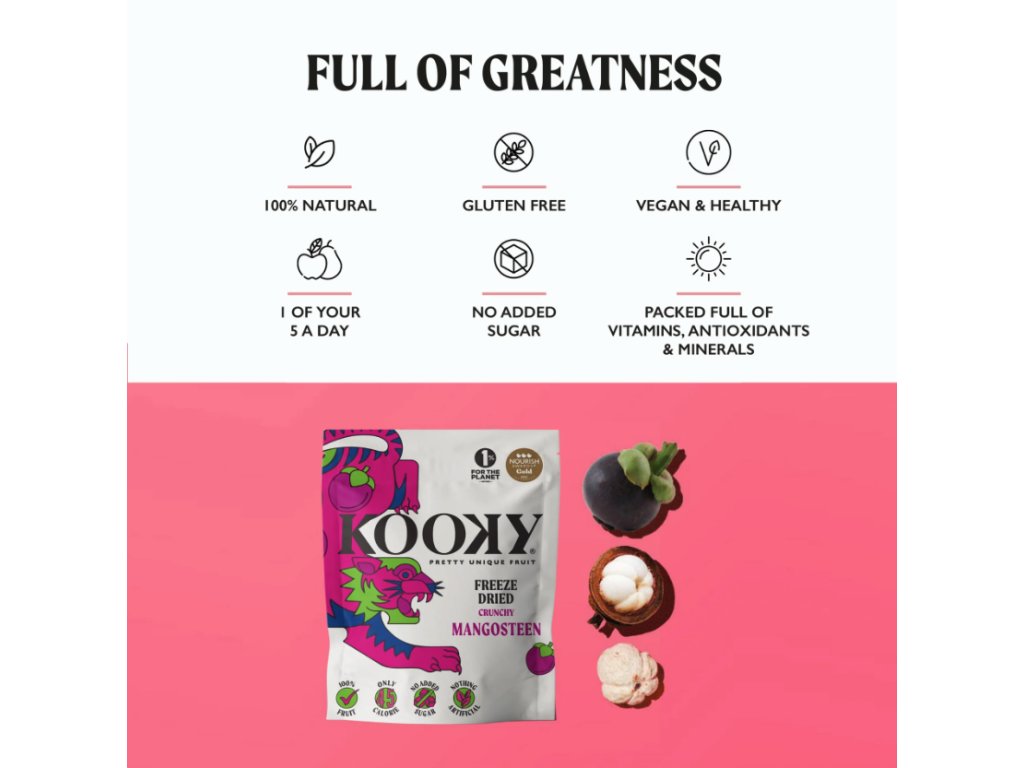 Kooky mrazom sušený mangostan je chrumkavý, 100 % ovocie, bez akýchkoľvek pridaných látok. Je vhodný pre vegánov a neobsahuje 14 hlavných alergénov. Každé 12g balenie obsahuje 4–5 čerstvých mangostanov najvyššej kvality (trieda AAA), čo zodpovedá približne 400 g čerstvého ovocia! Jemne sladký a osviežujúco kyselkavý – tento kúsok si získa každého a už teraz patrí medzi obľúbencov našej rodiny a priateľov. Bohatý na živiny a plný antioxidantov, mangostan bol obľúbeným ovocím kráľovnej Viktórie a právom ho považujeme za klenot v korunovačnom klenote značky Kooky!
