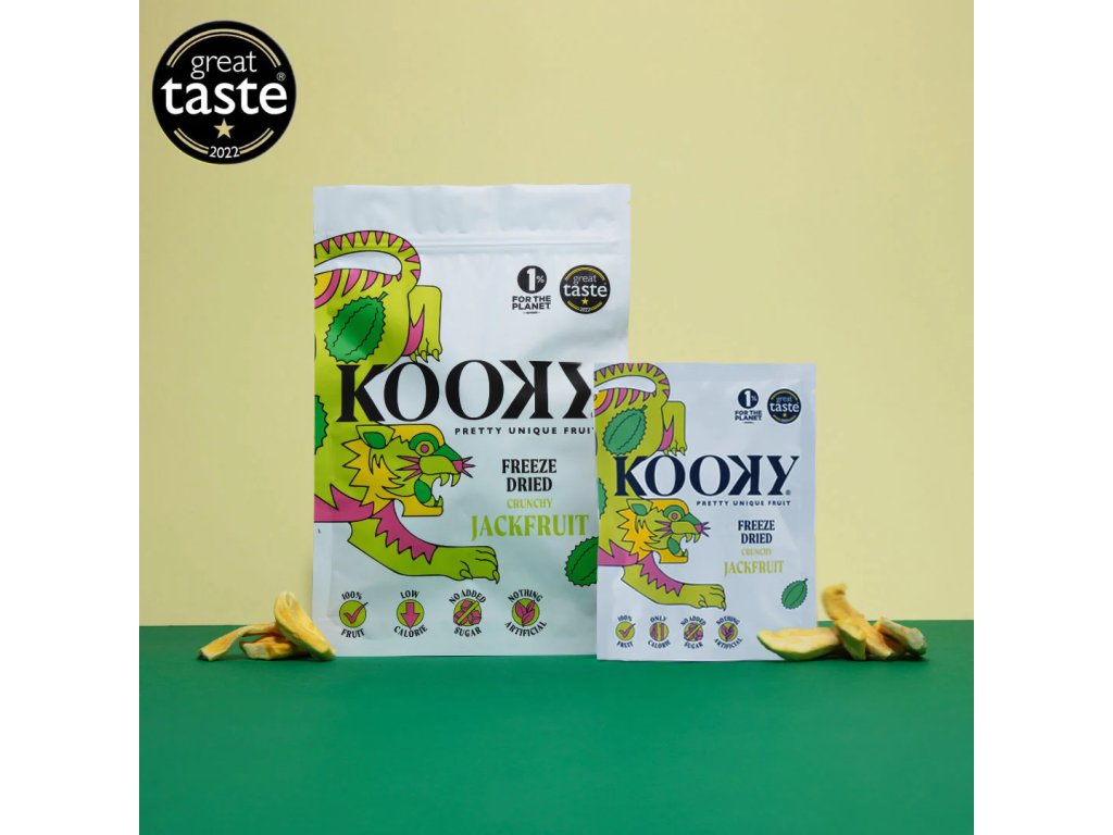 Náš chrumkavý jackfruit Kooky, získavaný udržateľným a etickým spôsobom z najlepších fariem v Thajsku a prirodzene sušený bez akýchkoľvek pridaných látok, je 100 % jackfruit (chlebovník), vegánsky a neobsahuje 14 hlavných alergénov. Každé 12g balenie obsahuje približne 70 g čerstvého ovocia. Jackfruit, ktorý je už medzi milovníkmi zeleniny obľúbenou náhradou mäsa, si rýchlo získava priazeň širokej verejnosti vďaka svojej výraznej chuti, nezvyčajnej štruktúre a množstvu zdraviu prospešných látok.